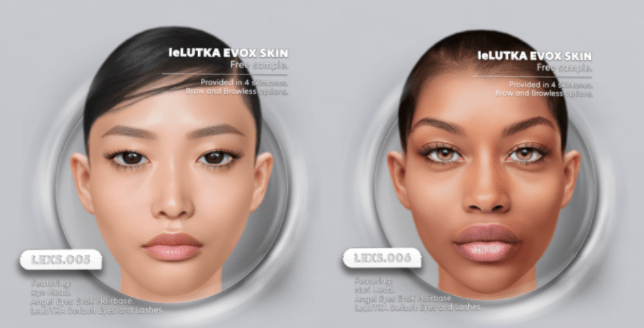 Lelutka has these 6 skin packs free for all. Each pack includes several skin options (4 skin tones and brow and browless), shape, and brow shape. Get them at Lelutka mainstore. TAXI!!!